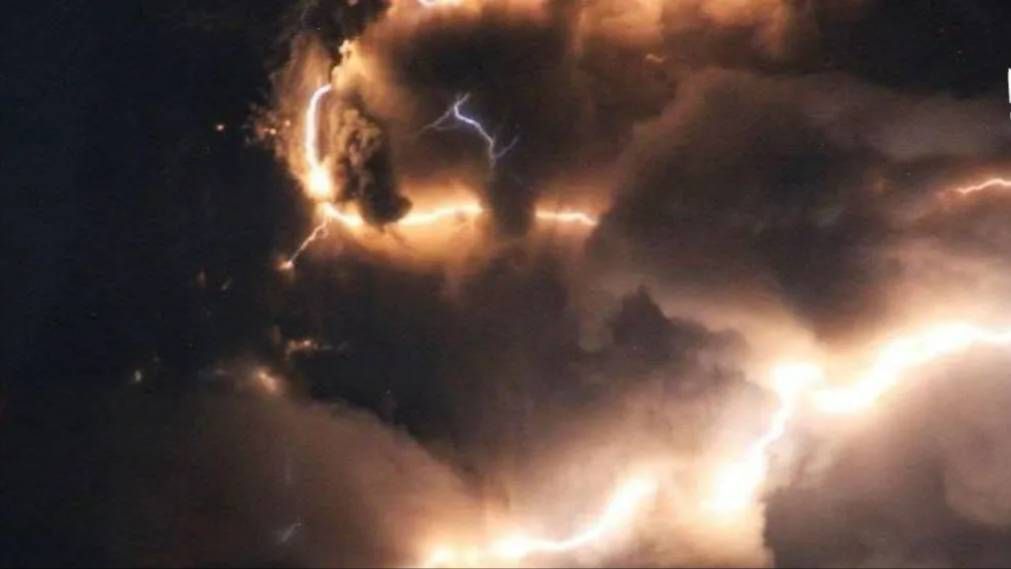 Зрелище апокалиптическое: вокруг бьют молнии, в небо поднимается столб жара, по склонам стекает лава.