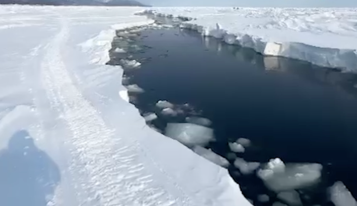 Рыбаки прыгают с отколовшейся льдины на Сахалине. Трещина уже несколько метров.