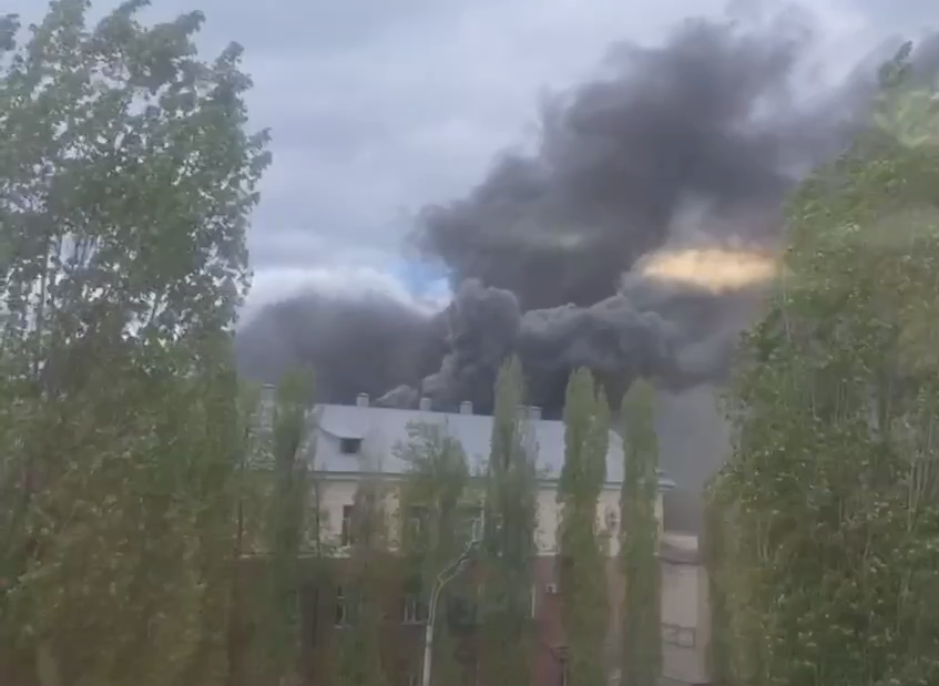 UPD. Площадь пожара 100 квадратов. Площадь цеха, где произошло возгорание, — три тысячи квадратов. Людей эвакуировали.