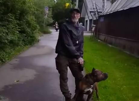 Соседка неадеквата рассказала, что ранее он был судим, лечился от зависимостей и живёт в посёлке около 13 лет. Сейчас сожительствует с некой дамой, о которой отзываются, как и о нём, кхм, нелестно. Вместе с ними на участке ютятся: алабай, амстафф, питбуль и другие бойцовские породы.